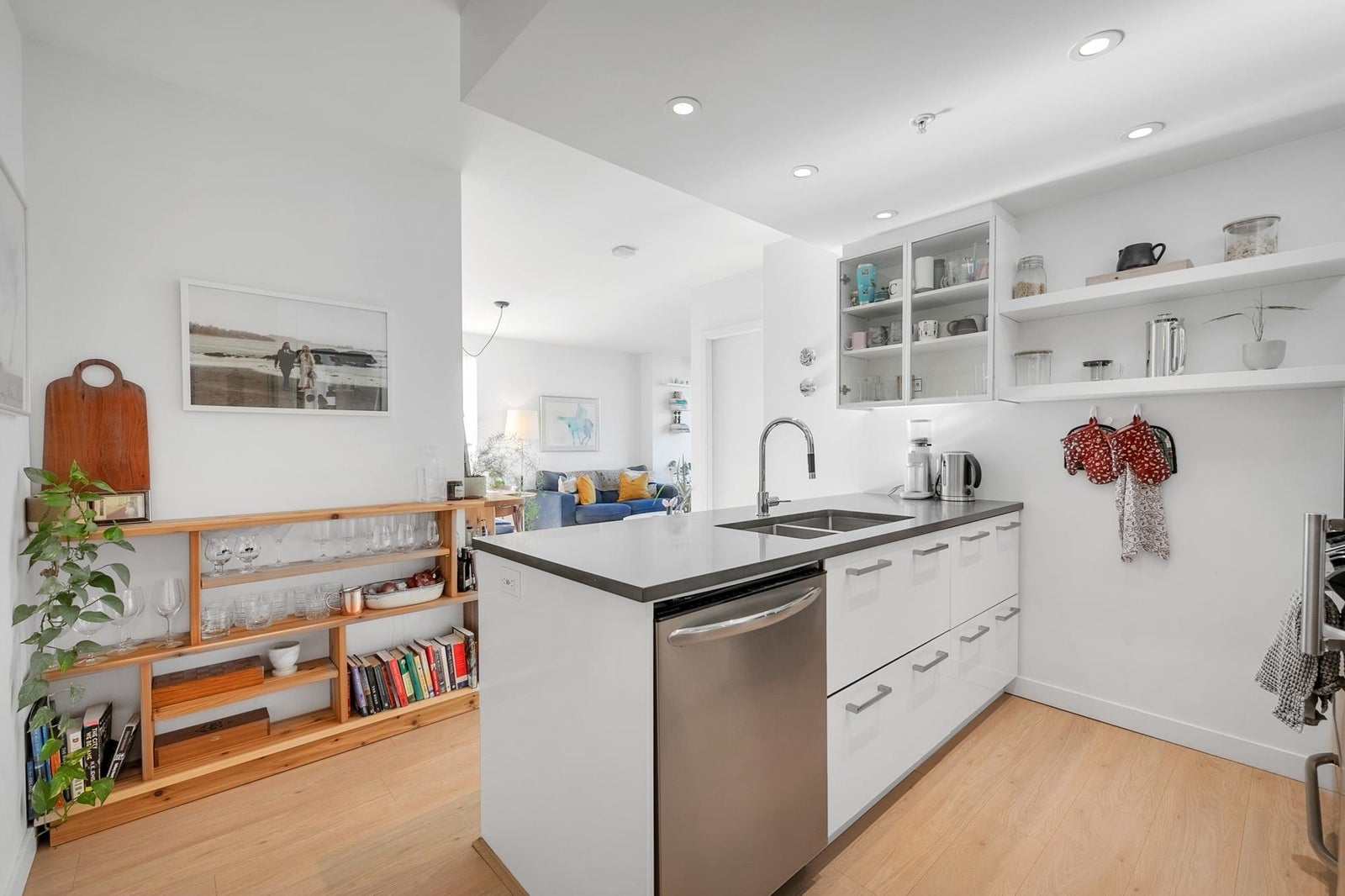 RARE, Northwest Corner 2 bed 2 bath home in Strathcona Village with sweeping views across the water to North Shore Mountains & Downtown. Function meets style in this airy living space, with top of the line stainless steel appliances, large island & extra shelving in the kitchen, textured laminate-wood flooring & custom built ins in all closets for maximum space. Roller blinds (blackouts in bedrooms!), deluxe ensuite with storage-friendly vanity, thoughtfully upgraded glass wall in the guest shower & smart home thermostats for ultimate comfort. Large windows accentuate the Ocean & Mountains to the North, and unobstructed City to the West. A must see!! One parking and One locker included.