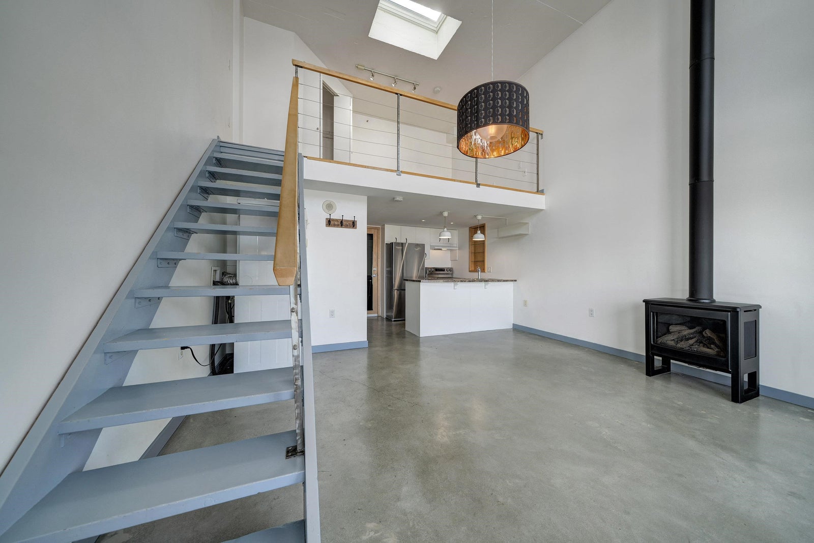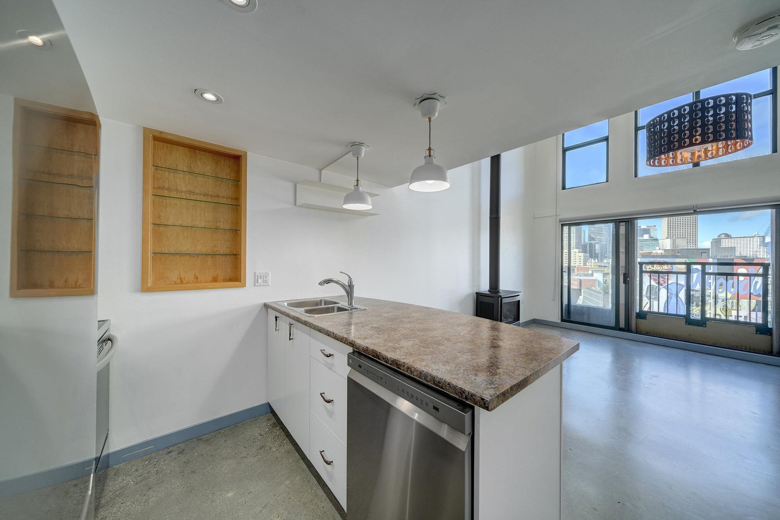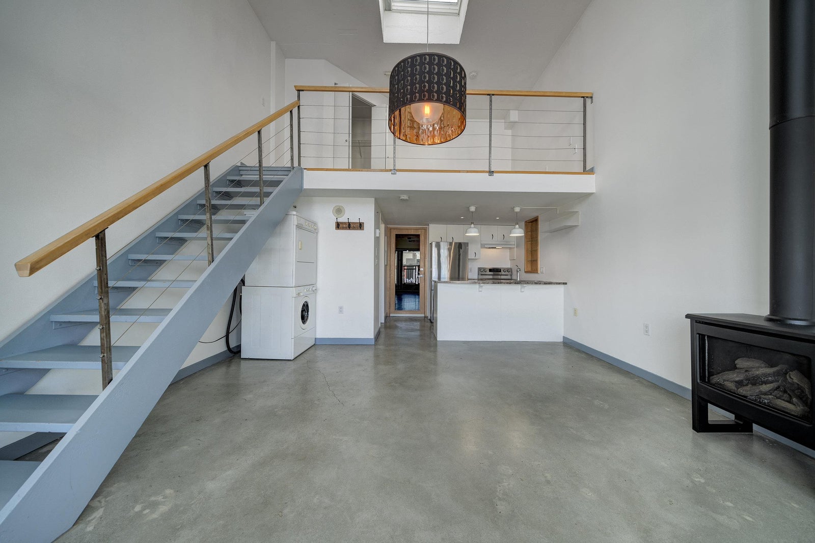 New York-style penthouse loft in the Van Horne building - Gastown. Outstanding creative space with concrete floors, 16" ceiling, and panoramic views of the water, mountains, and the city. The space features large floor-to-ceiling windows and a constantly moving picture of the world outside - it is light and bright. There is a Juliet balcony with double sliders, built-in shelving, a freshly painted kitchen with newer appliances, in-suite laundry, plus a free-standing gas fireplace for ambience. The upper loft is 188 SFT and can be used as a bedroom or creative space with a sizable walk-in closet. The Gastown location is vibrant, with access to amazing restaurants, bars, cafes, and boutique shops. You are also steps from parks such as Crab Park, Dr. Sun-Yat Sen Gardens, and the Canada Line.
