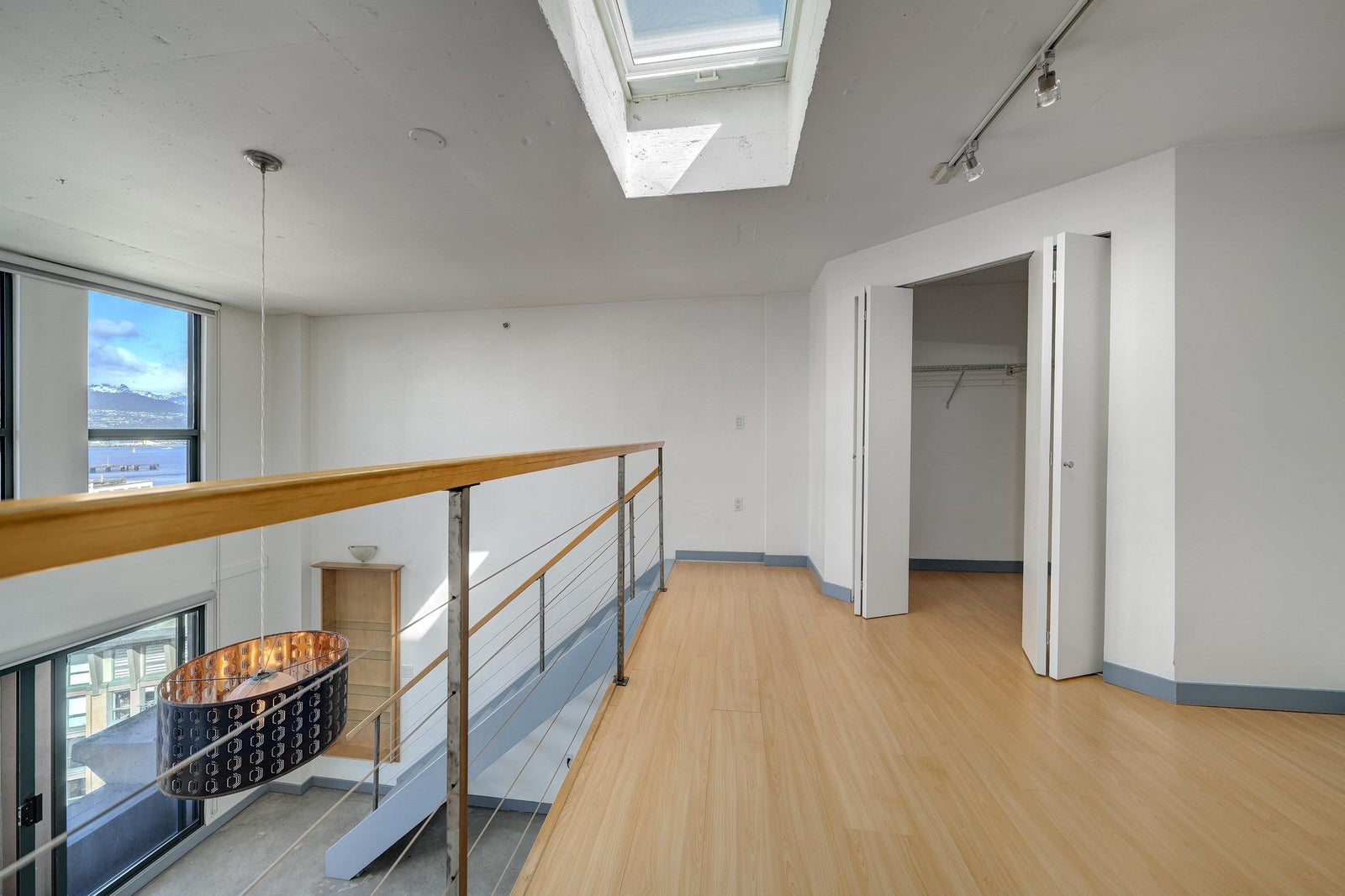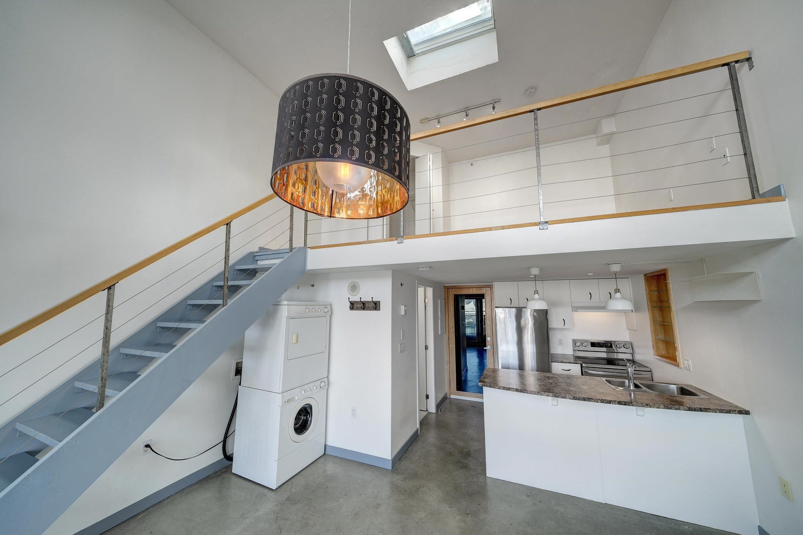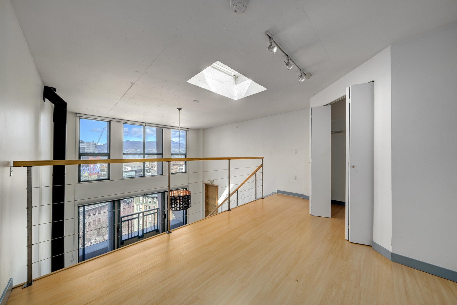 New York-style penthouse loft in the Van Horne building - Gastown. Outstanding creative space with concrete floors, 16" ceiling, and panoramic views of the water, mountains, and the city. The space features large floor-to-ceiling windows and a constantly moving picture of the world outside - it is light and bright. There is a Juliet balcony with double sliders, built-in shelving, a freshly painted kitchen with newer appliances, in-suite laundry, plus a free-standing gas fireplace for ambience. The upper loft is 188 SFT and can be used as a bedroom or creative space with a sizable walk-in closet. The Gastown location is vibrant, with access to amazing restaurants, bars, cafes, and boutique shops. You are also steps from parks such as Crab Park, Dr. Sun-Yat Sen Gardens, and the Canada Line.