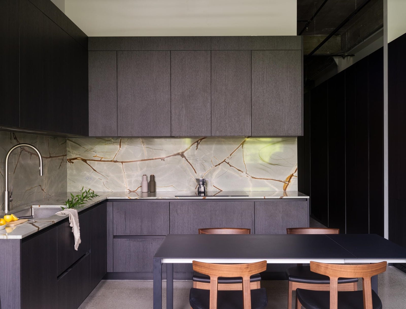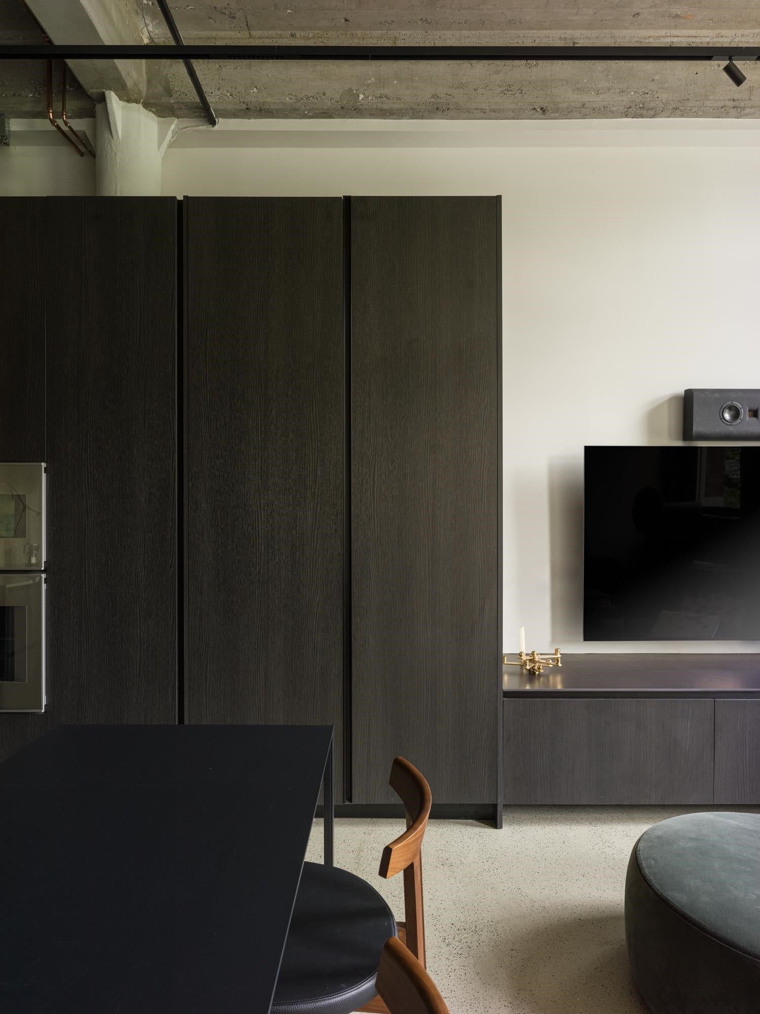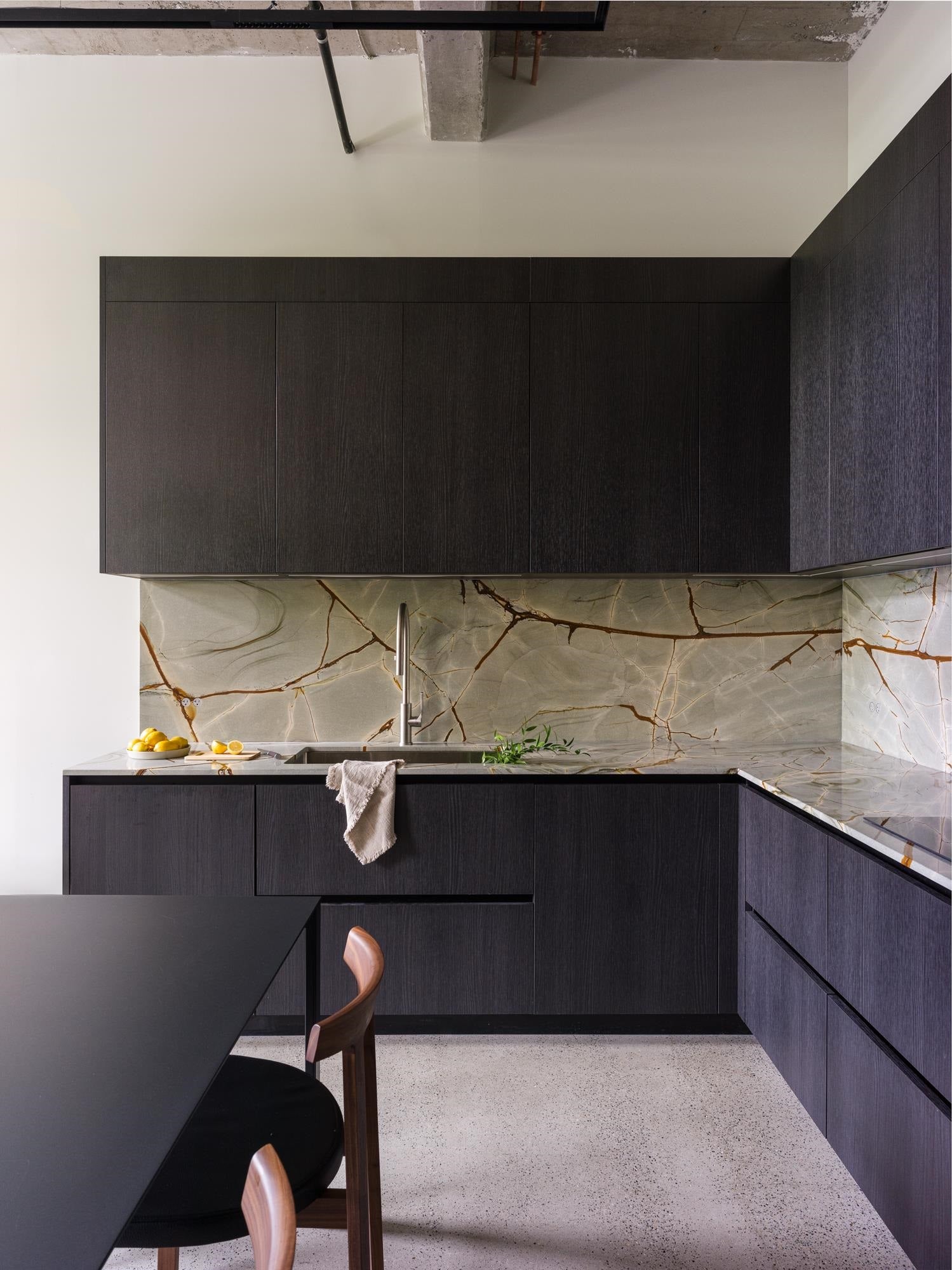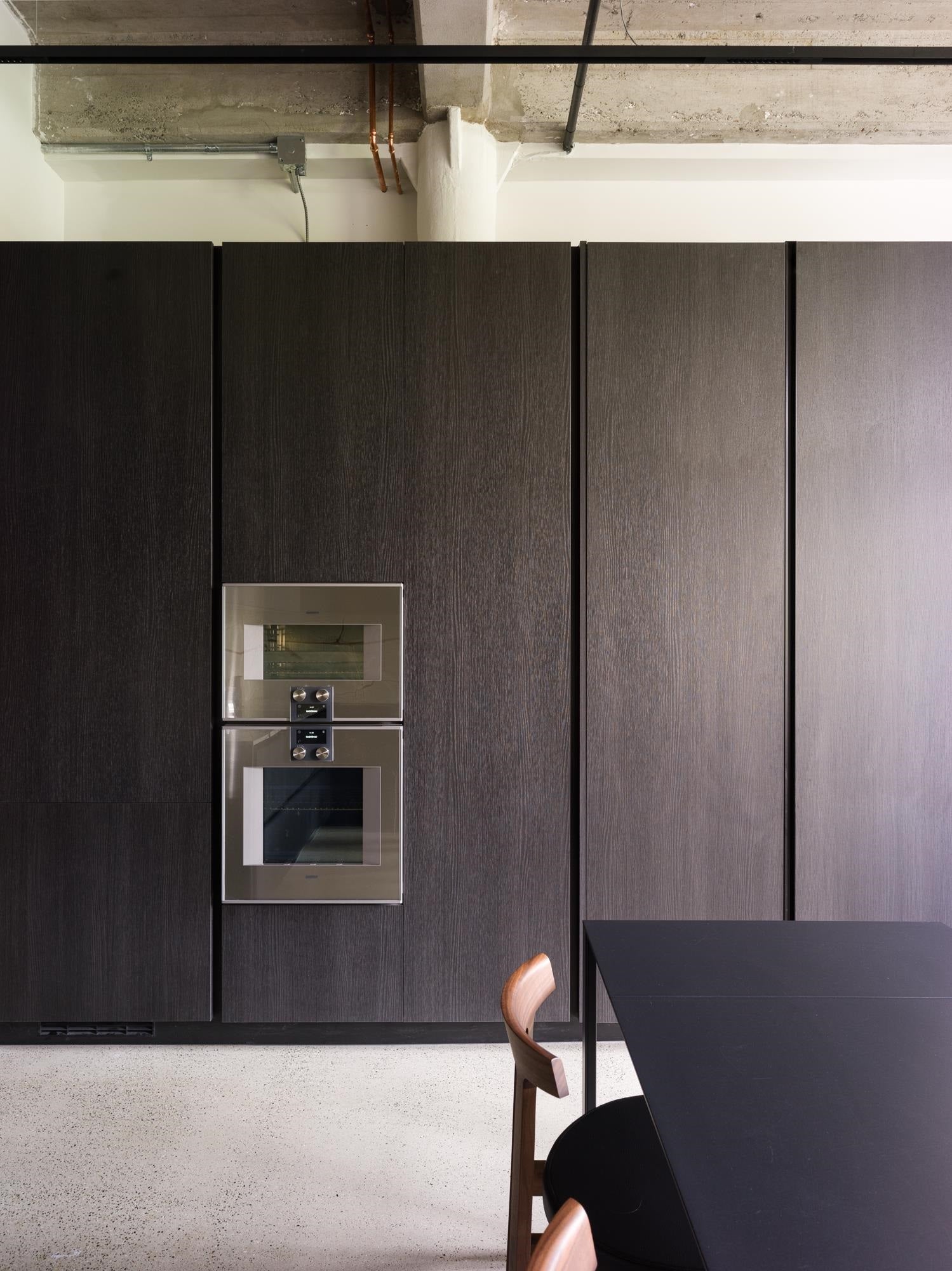 The Designer’s Loft – A Heritage Warehouse Reimagined in Vancouver Set within the historic Crane Building, this reimagined loft reflects a refined dialogue between heritage character and contemporary design. Completed in 2024 by Kipp Design Build, the nearly 800-square-foot residence has been thoughtfully reconfigured to maximize function and flow. A bold black Italian kitchen by Habitat, paired with Gaggenau appliances, anchors the living space, while bespoke wardrobes by Inform Interiors provide seamless storage. The bathroom offers a calm, spa-like retreat with stone, walnut, and a steam shower featuring fixtures by Gessi. Polished concrete floors, exposed brick, and 12-foot ceilings are softened by warm light from the west-facing windows—an elevated expression of urban living.