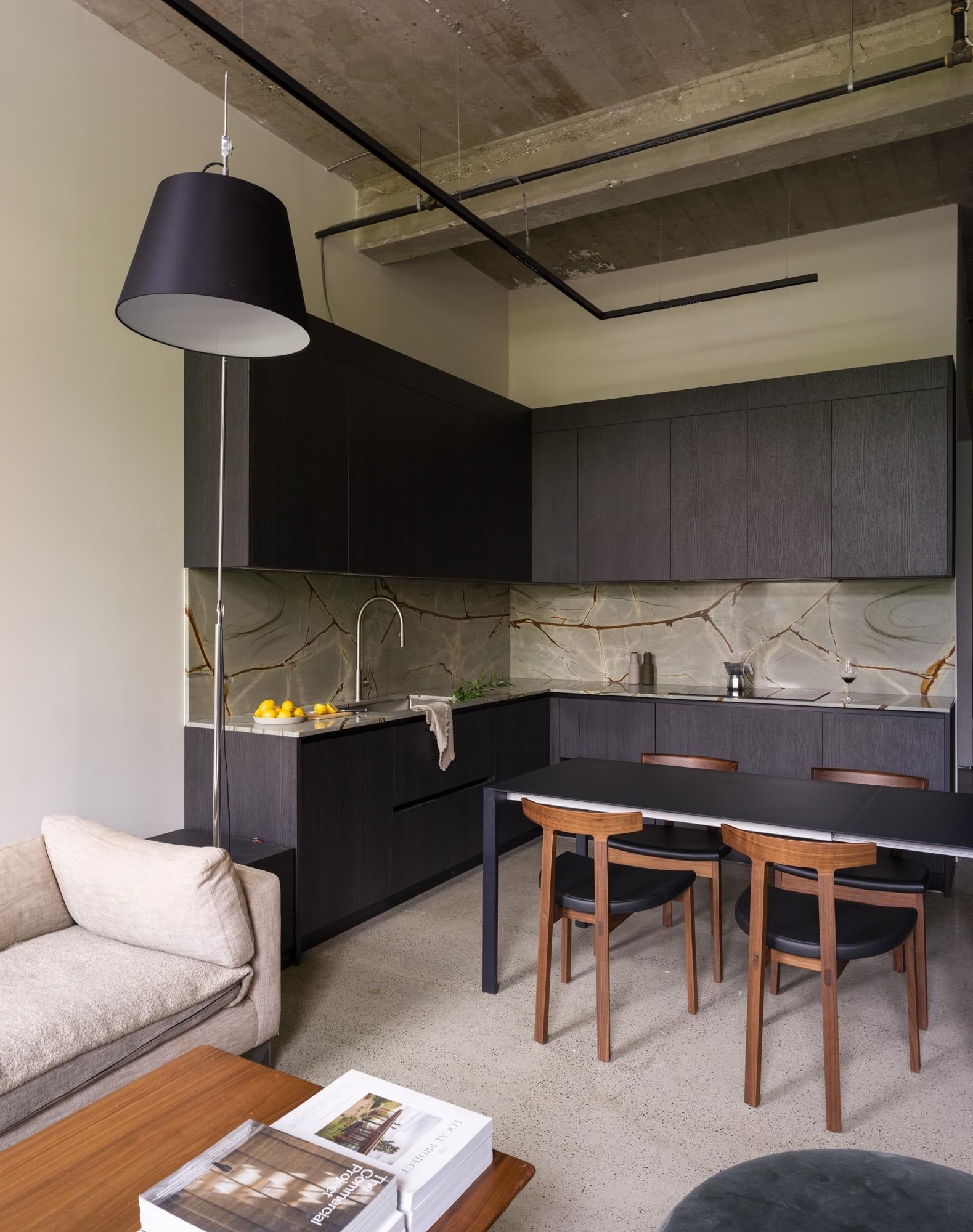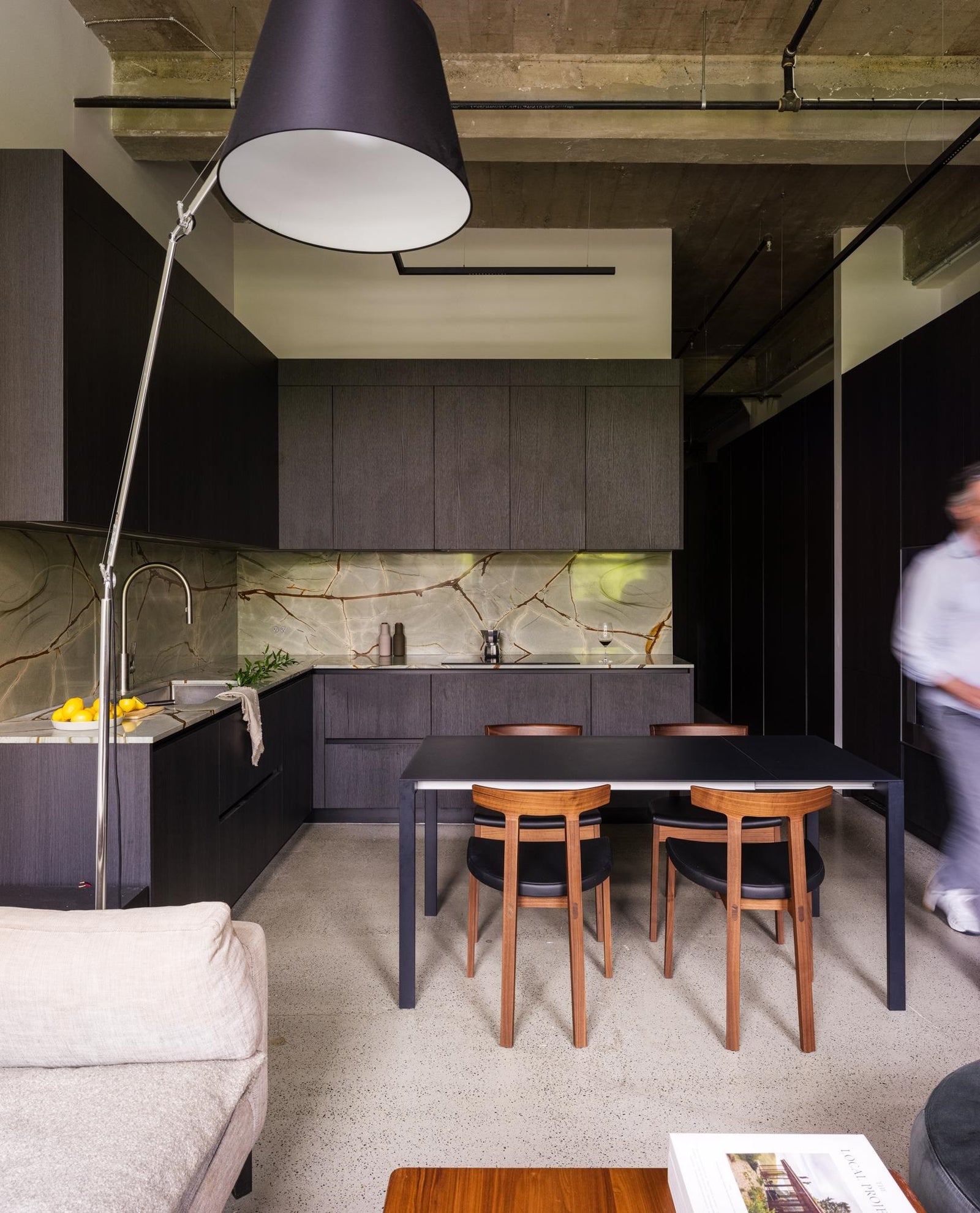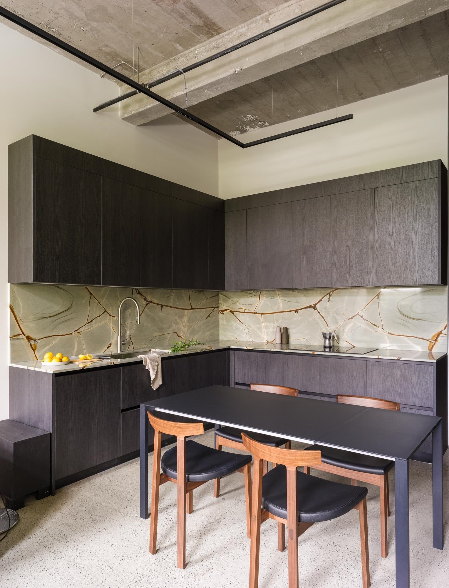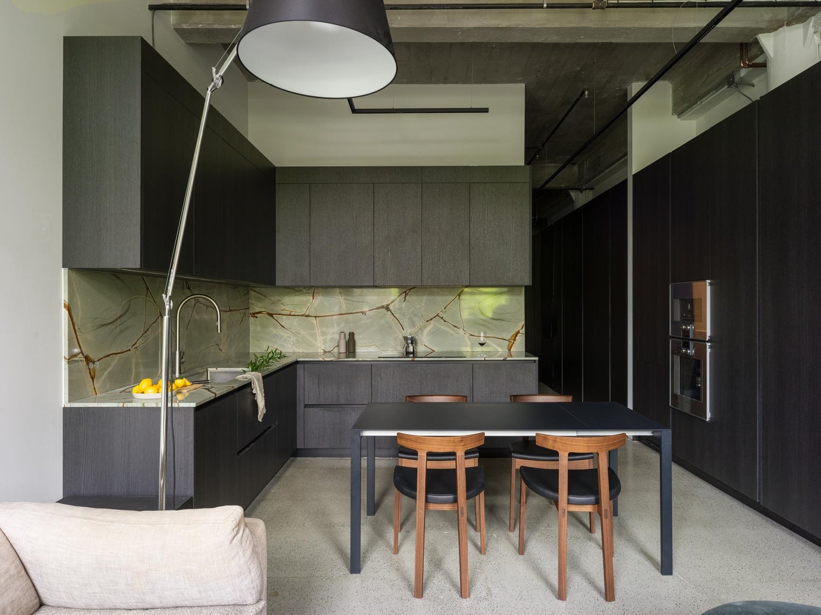 The Designer’s Loft – A Heritage Warehouse Reimagined in Vancouver Set within the historic Crane Building, this reimagined loft reflects a refined dialogue between heritage character and contemporary design. Completed in 2024 by Kipp Design Build, the nearly 800-square-foot residence has been thoughtfully reconfigured to maximize function and flow. A bold black Italian kitchen by Habitat, paired with Gaggenau appliances, anchors the living space, while bespoke wardrobes by Inform Interiors provide seamless storage. The bathroom offers a calm, spa-like retreat with stone, walnut, and a steam shower featuring fixtures by Gessi. Polished concrete floors, exposed brick, and 12-foot ceilings are softened by warm light from the west-facing windows—an elevated expression of urban living.