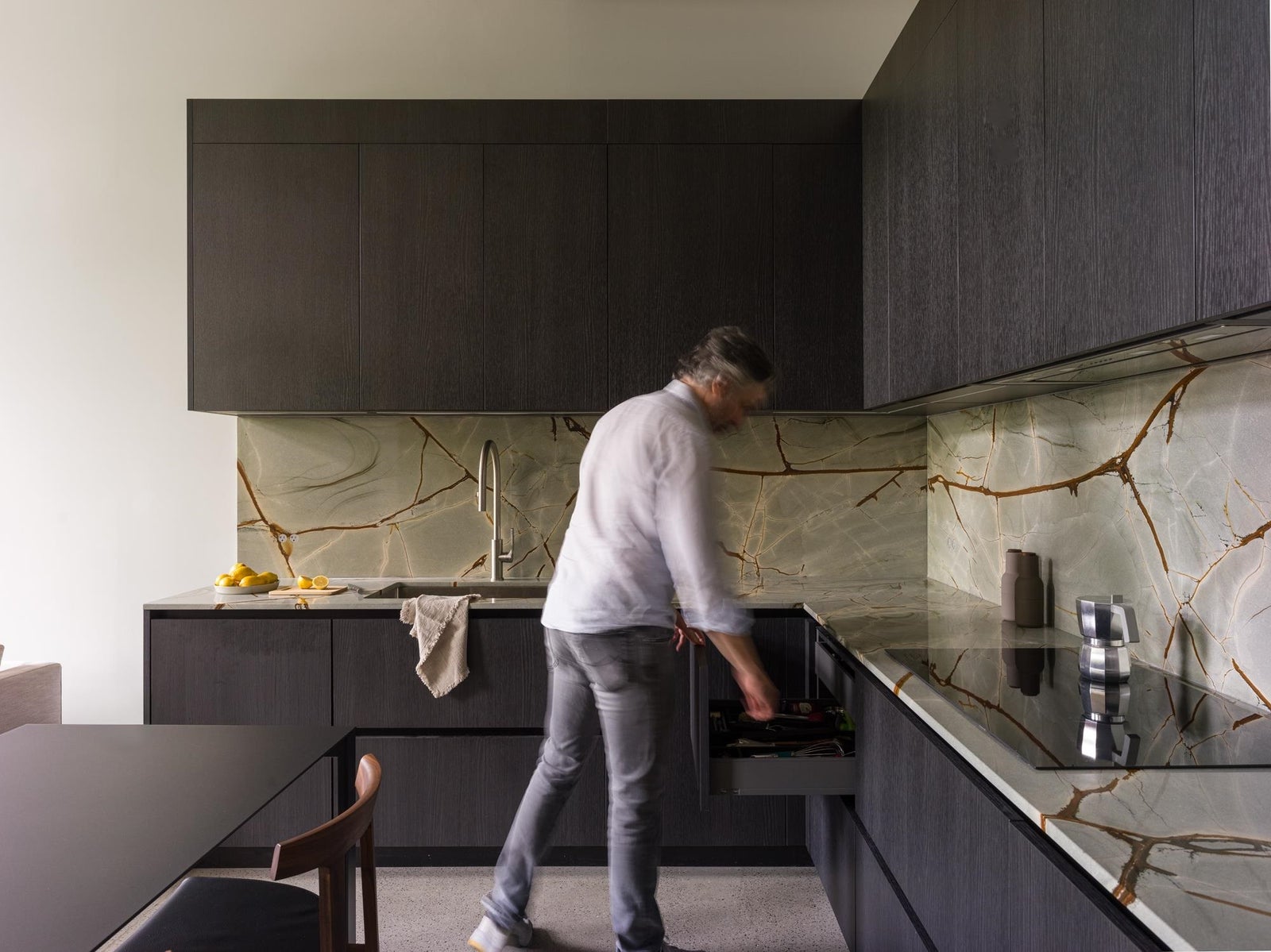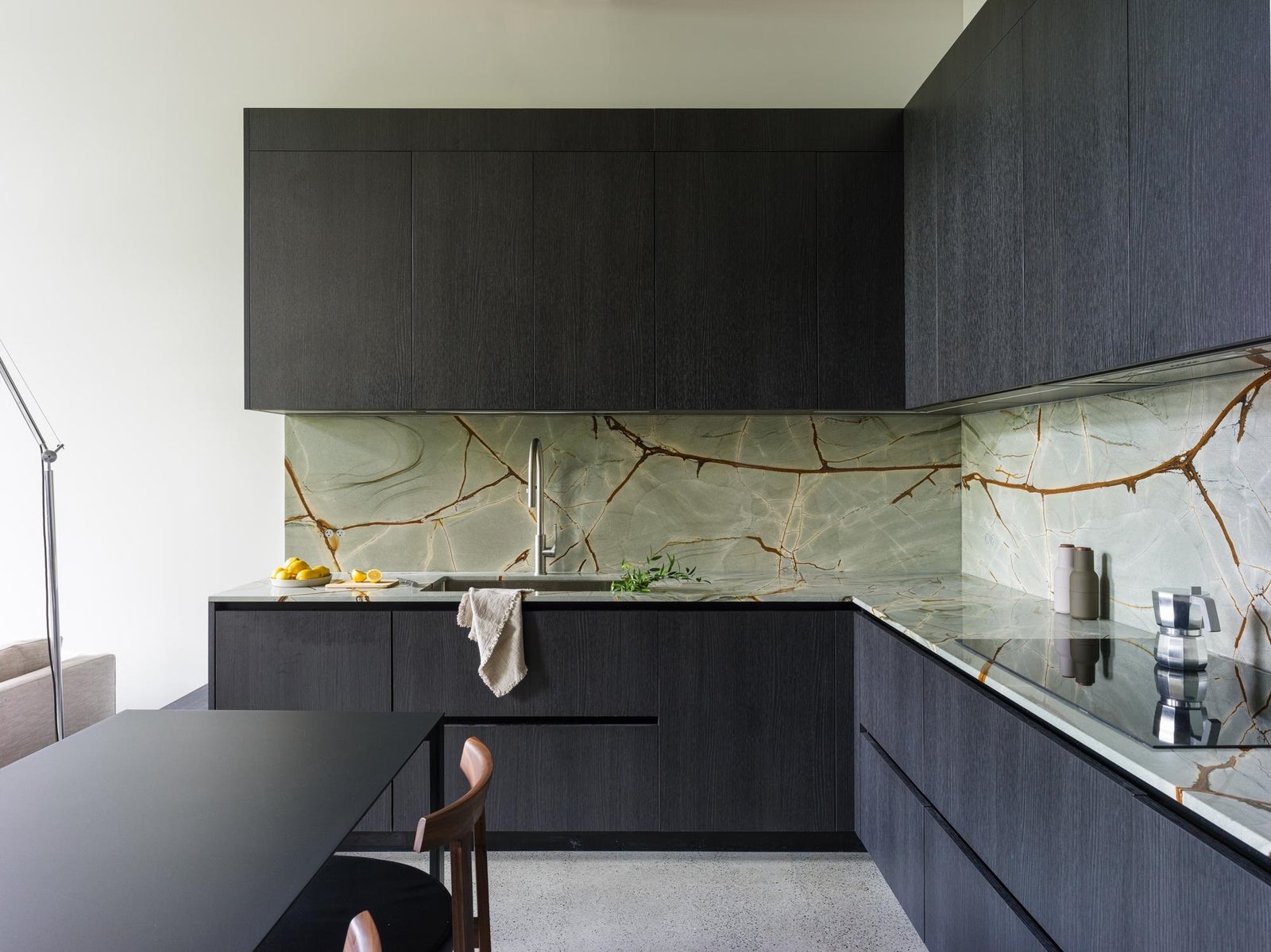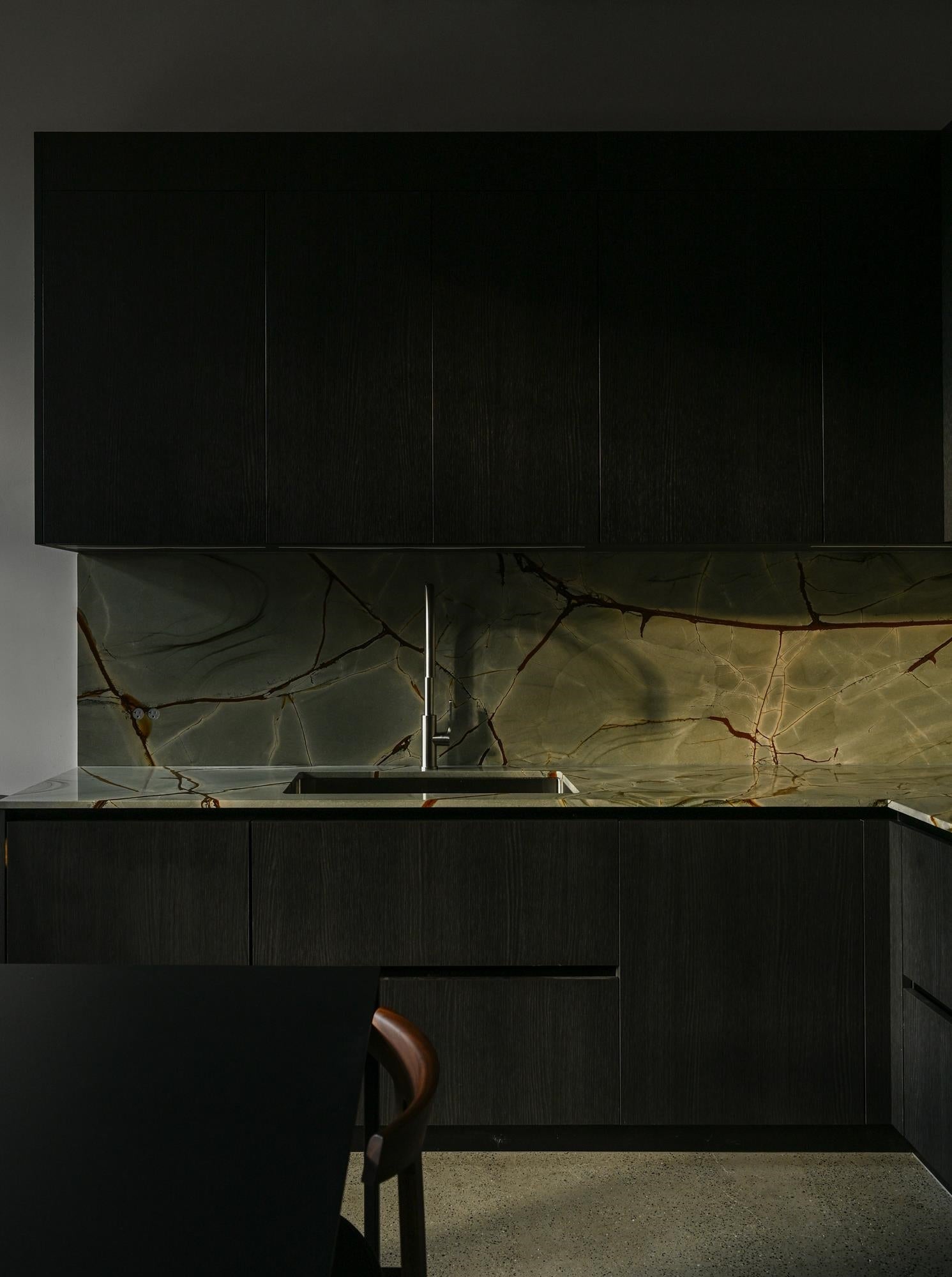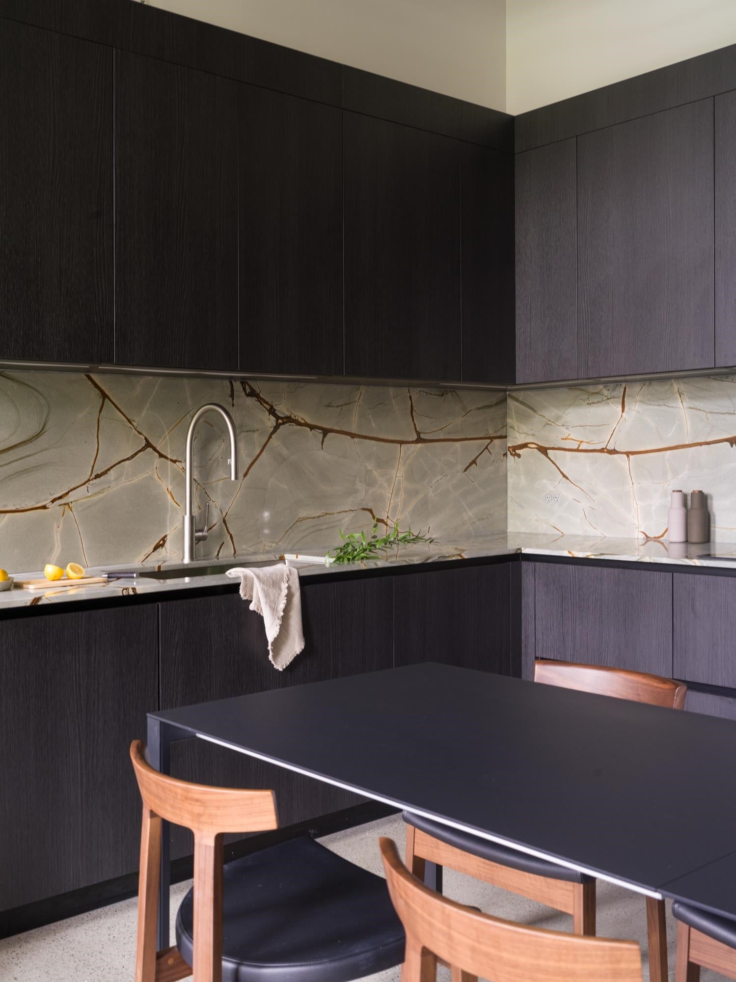 The Designer’s Loft – A Heritage Warehouse Reimagined in Vancouver Set within the historic Crane Building, this reimagined loft reflects a refined dialogue between heritage character and contemporary design. Completed in 2024 by Kipp Design Build, the nearly 800-square-foot residence has been thoughtfully reconfigured to maximize function and flow. A bold black Italian kitchen by Habitat, paired with Gaggenau appliances, anchors the living space, while bespoke wardrobes by Inform Interiors provide seamless storage. The bathroom offers a calm, spa-like retreat with stone, walnut, and a steam shower featuring fixtures by Gessi. Polished concrete floors, exposed brick, and 12-foot ceilings are softened by warm light from the west-facing windows—an elevated expression of urban living.