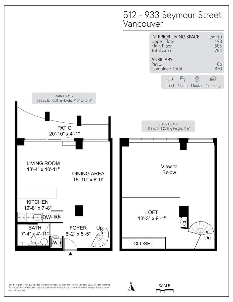 Airbnb-friendly and perfectly timed for FIFA and summer in Vancouver, this unique loft offers 16ft ceilings in a solid concrete building. Quiet and private with patio and garden outlook over an extended rooftop, it feels removed from the city. Extra-wide layout with beautiful natural light and no harsh exposure. Freshly painted with new roller blinds, main floor laundry and bathroom, large kitchen island and generous living/dining space. Lots of room for a home office and guest setup with pull out couch. Features a space-saving spiral staircase, the only one in the building, and no unauthorized space. Amenities include gym, concierge, party room, plus the largest private storage locker (6’x7’x16’) and 1 parking. Pets, rentals and short-term rentals allowed. Open April 4 & 5, 2–4pm.