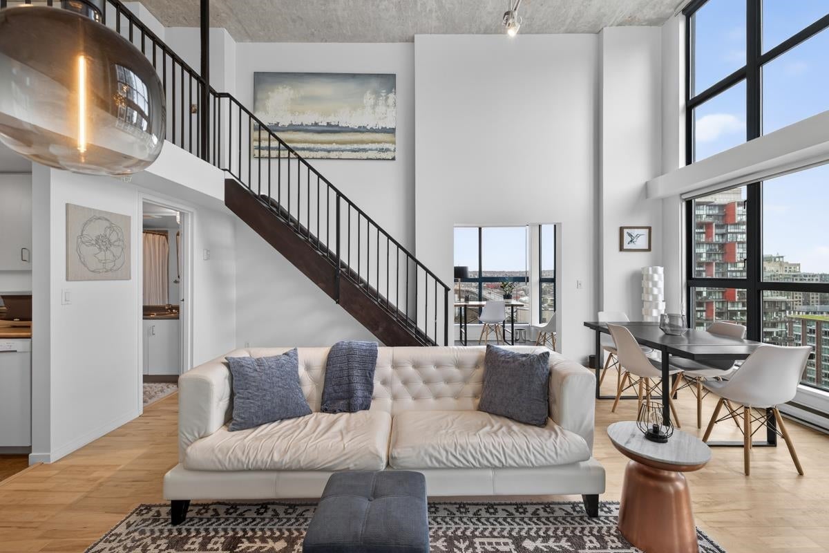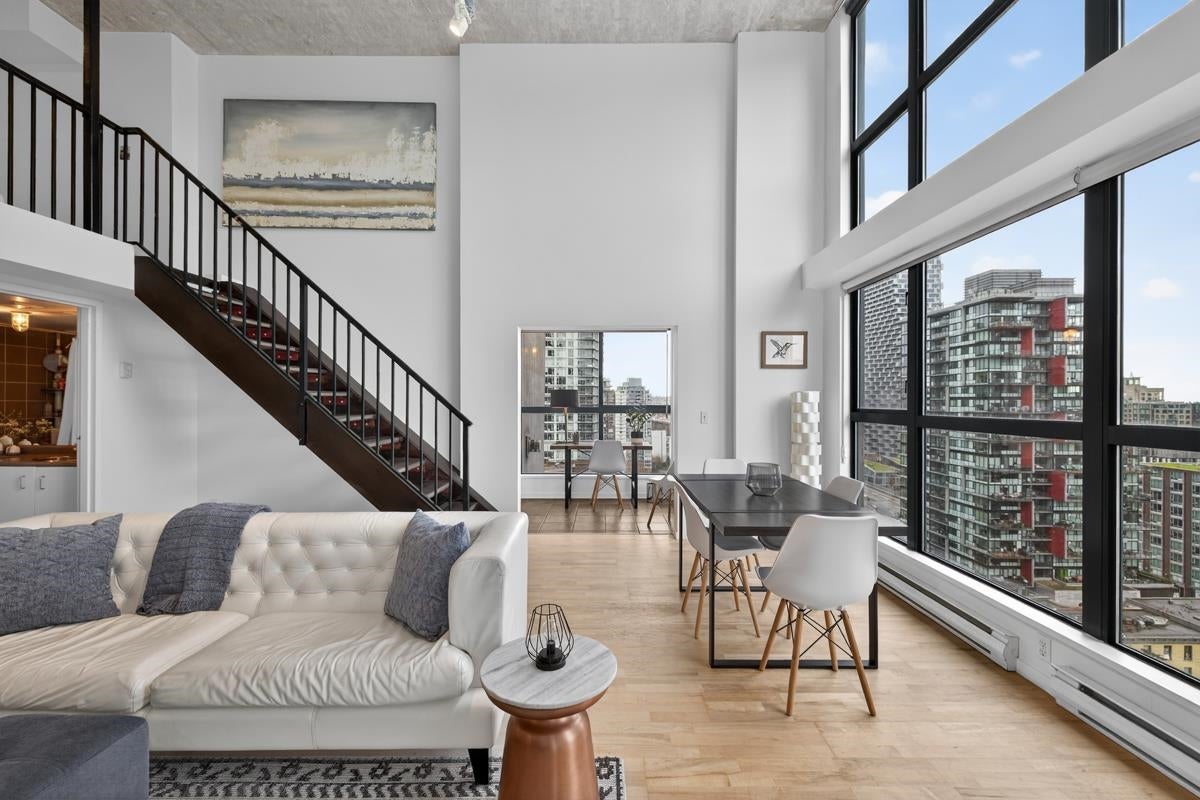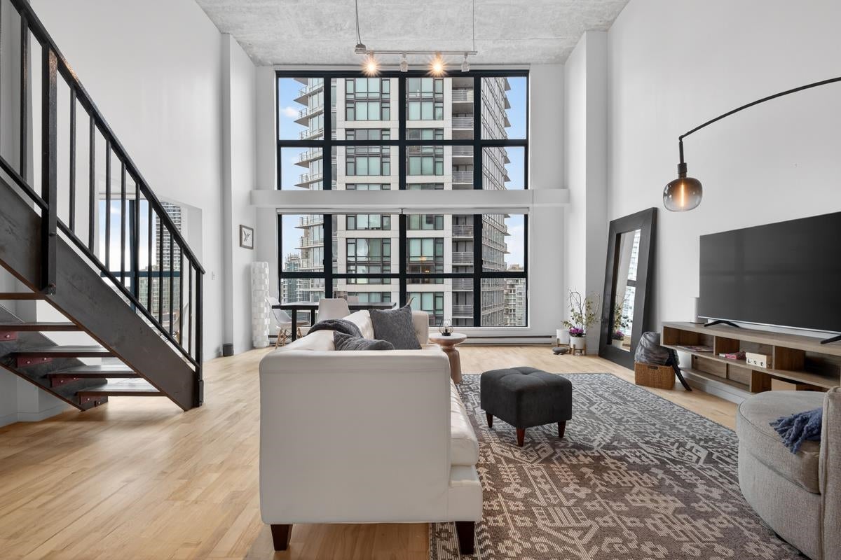 Experience iconic Yaletown loft living in this stunning southwest-facing home boasting 875 sqft of open-concept space with soaring 15-ft ceilings. Dramatic double-height windows bathe the interior in natural light while framing western city views and southern outlooks toward the Granville Street Bridge. Thoughtfully updated with new flooring, fresh paint, and carpeting throughout. The flexible layout offers an expansive living area, den/flex space, and a lofted bedroom complete with walk-in closet - capturing the true essence of loft living. Located in the well-maintained Space building, you're steps from Yaletown's best restaurants, cafes, ameneties, David Lam Park, and the beloved seawall. A rare opportunity to own a piece of Vancouver's most vibrant neighbourhood.