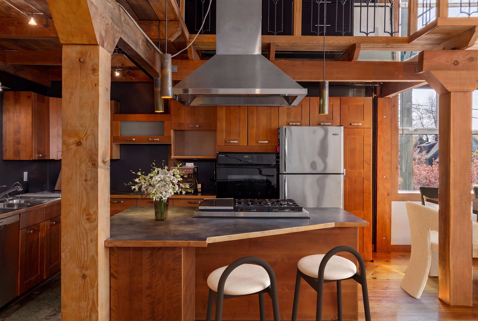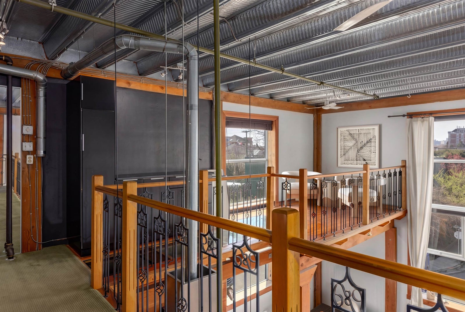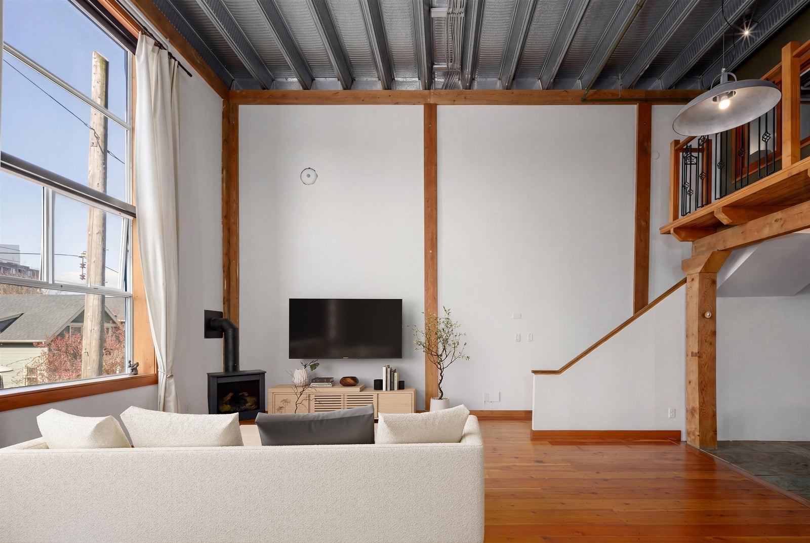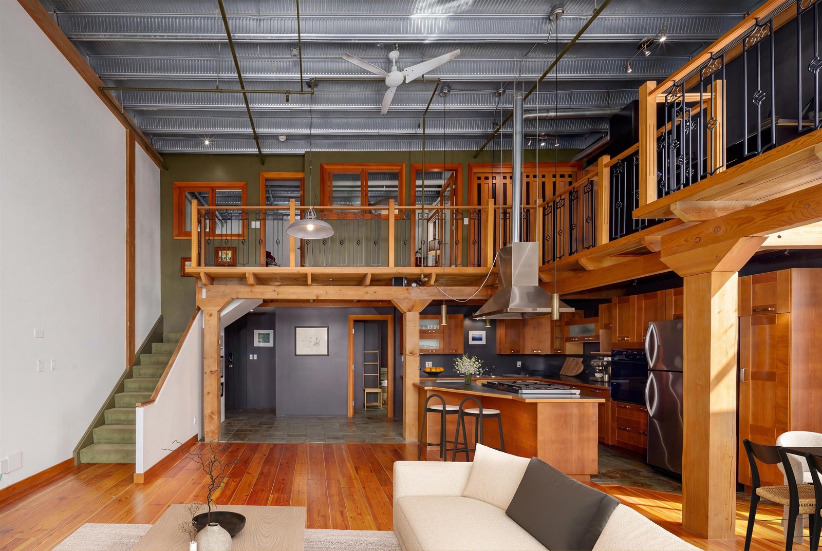 This 2 bedroom live/work loft space at The Workshop is a post-industrial style gem. Over 1500 sqft of bright open-plan living space is accentuated by soaring 17ft ceilings, gorgeous millwork and expansive windows with beautiful outlooks of tree-lined streets and cityscape. Inside, natural fir posts & beams and wide-plank flooring imbue the space with warmth, as does the welcoming gas fireplace. Other standout features include glass flooring in the 2nd floor office nook, gourmet kitchen with island and wrought iron railings. Heated slate flooring in the main bathroom, solar-reduction windows, double-insulated walls and large ceiling fans offer additional comfort. Ideally situated on the quiet SW corner of this concrete & steel building, enjoy living in vibrant Strathcona. 1 secured parking.
