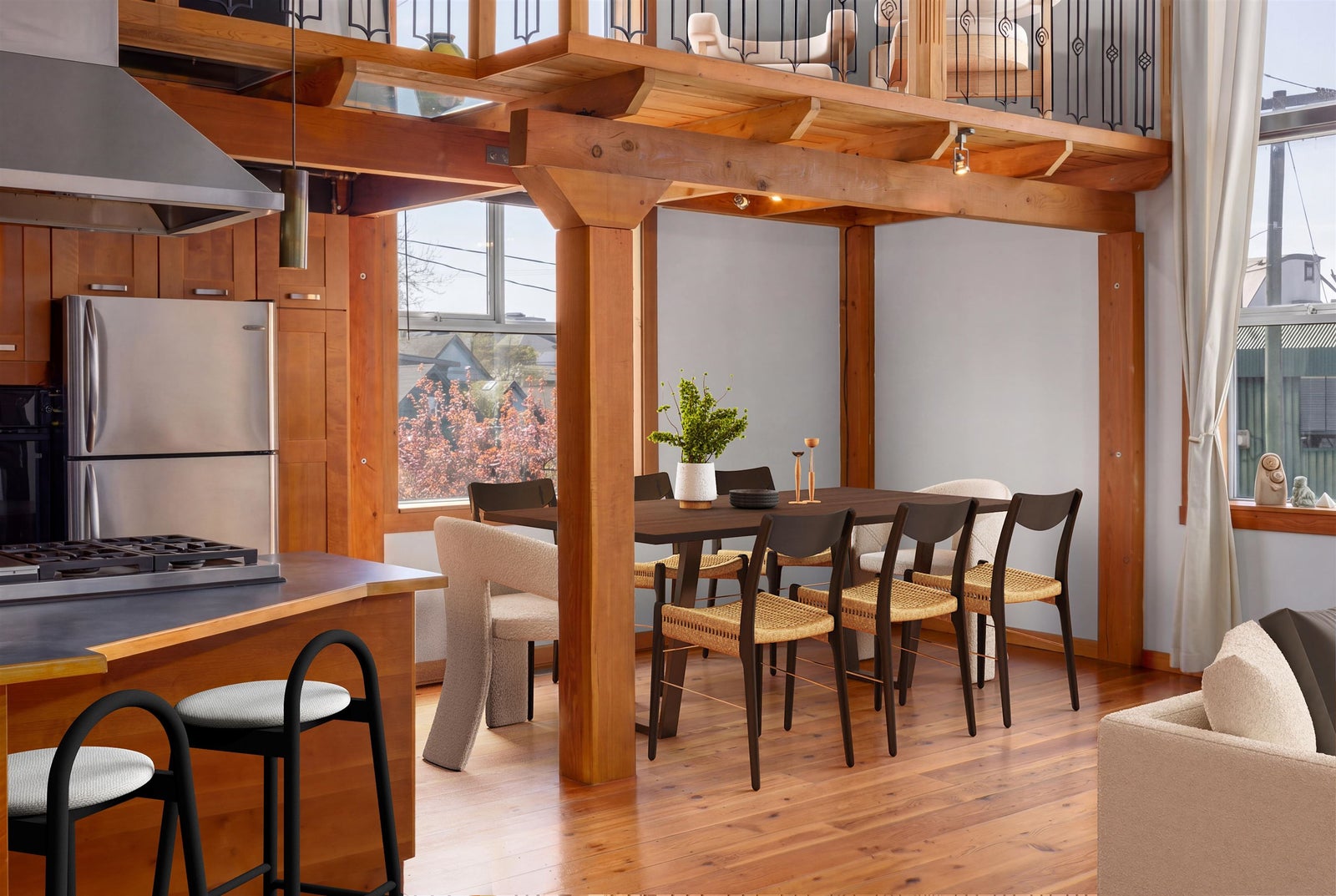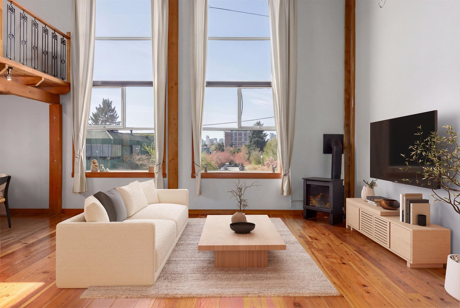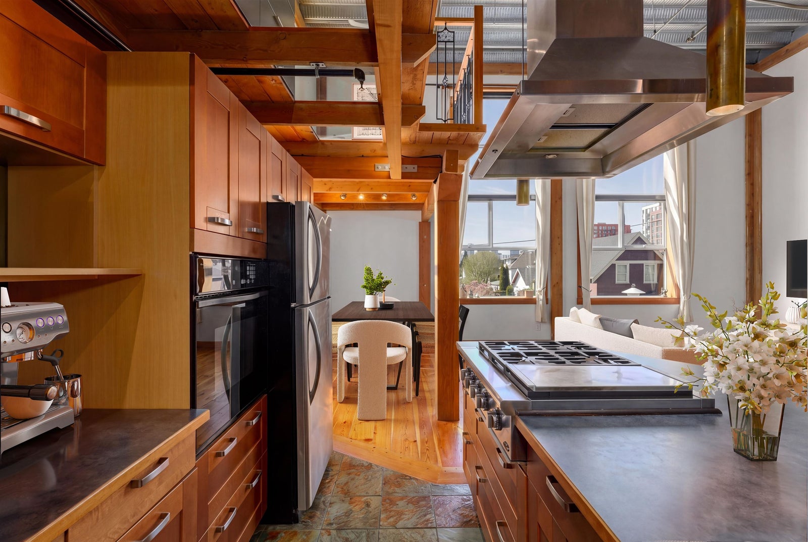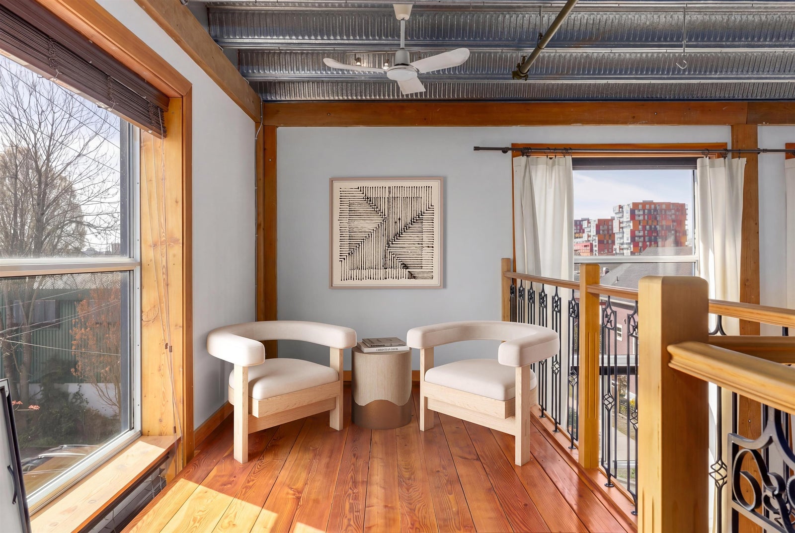 This 2 bedroom live/work loft space at The Workshop is a post-industrial style gem. Over 1500 sqft of bright open-plan living space is accentuated by soaring 17ft ceilings, gorgeous millwork and expansive windows with beautiful outlooks of tree-lined streets and cityscape. Inside, natural fir posts & beams and wide-plank flooring imbue the space with warmth, as does the welcoming gas fireplace. Other standout features include glass flooring in the 2nd floor office nook, gourmet kitchen with island and wrought iron railings. Heated slate flooring in the main bathroom, solar-reduction windows, double-insulated walls and large ceiling fans offer additional comfort. Ideally situated on the quiet SW corner of this concrete & steel building, enjoy living in vibrant Strathcona. 1 secured parking.