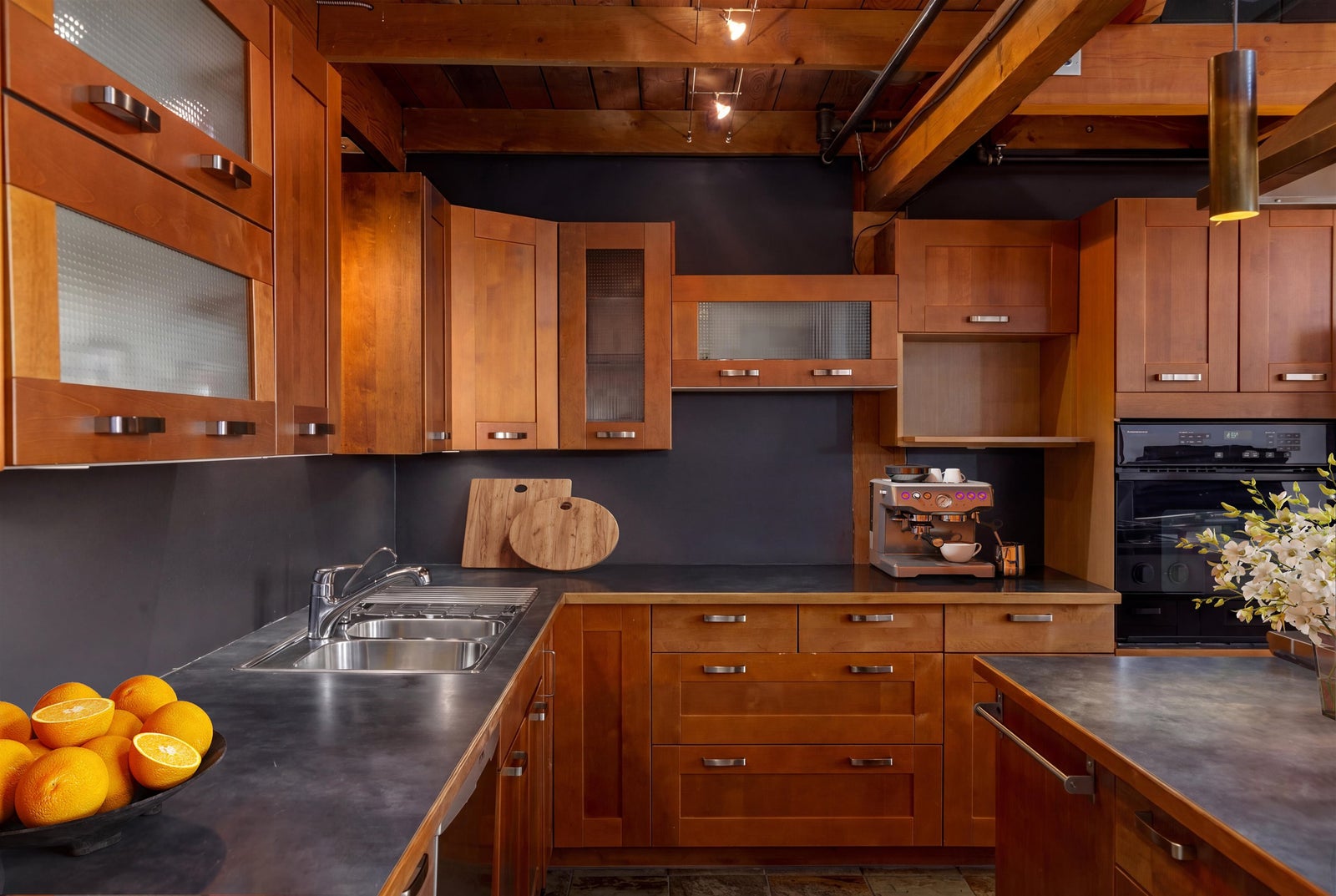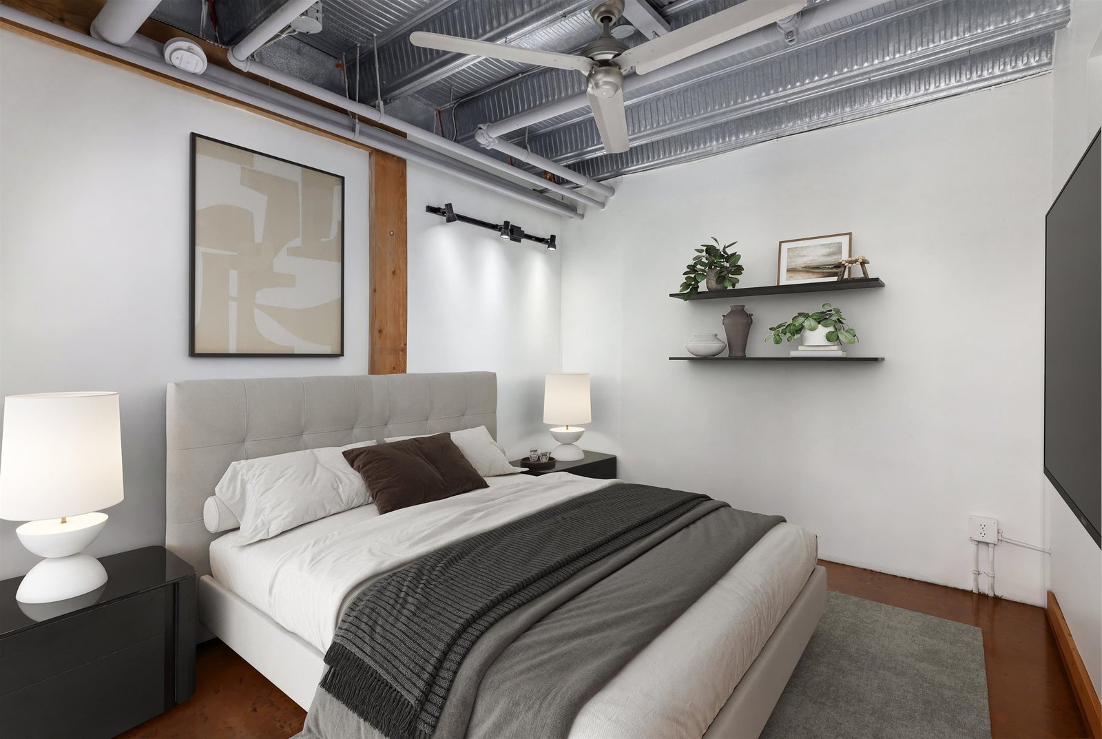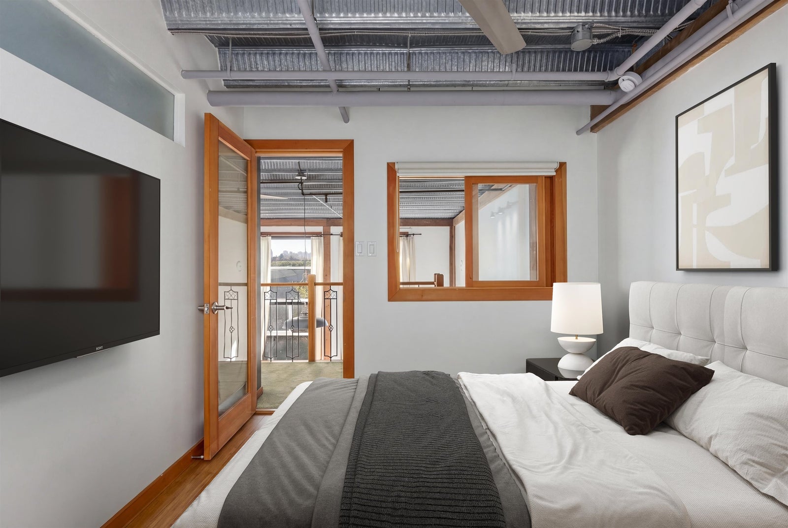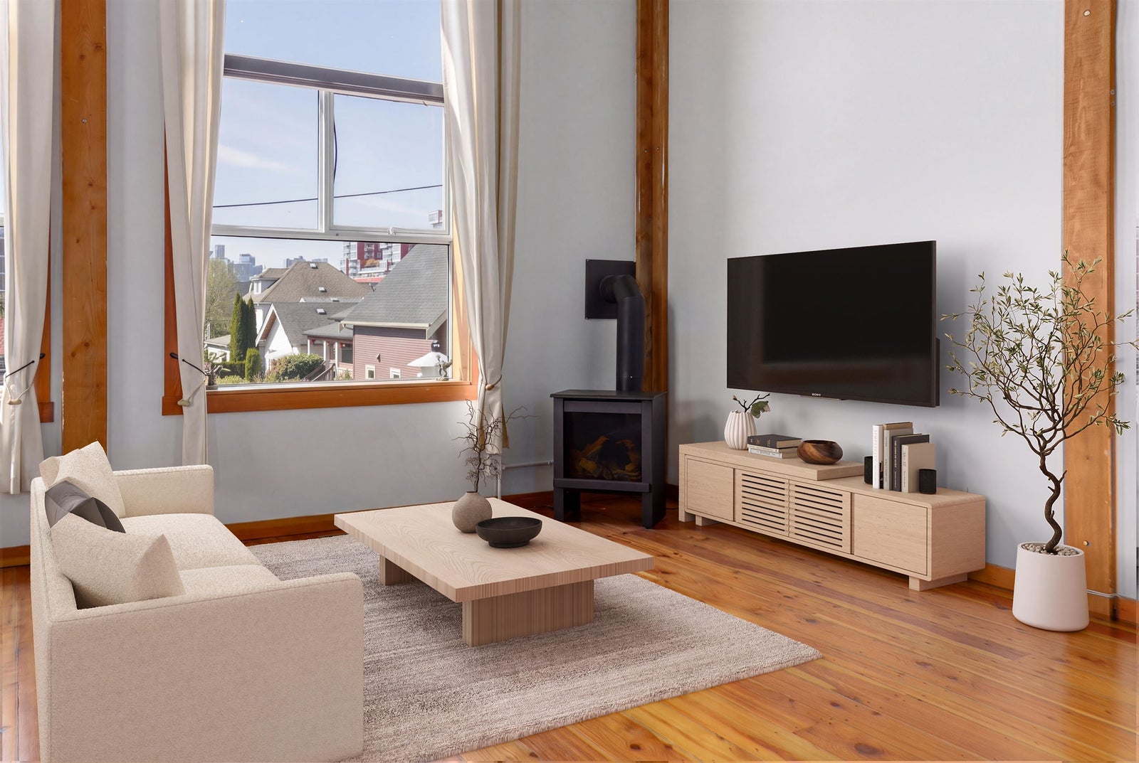 This 2 bedroom live/work loft space at The Workshop is a post-industrial style gem. Over 1500 sqft of bright open-plan living space is accentuated by soaring 17ft ceilings, gorgeous millwork and expansive windows with beautiful outlooks of tree-lined streets and cityscape. Inside, natural fir posts & beams and wide-plank flooring imbue the space with warmth, as does the welcoming gas fireplace. Other standout features include glass flooring in the 2nd floor office nook, gourmet kitchen with island and wrought iron railings. Heated slate flooring in the main bathroom, solar-reduction windows, double-insulated walls and large ceiling fans offer additional comfort. Ideally situated on the quiet SW corner of this concrete & steel building, enjoy living in vibrant Strathcona. 1 secured parking.